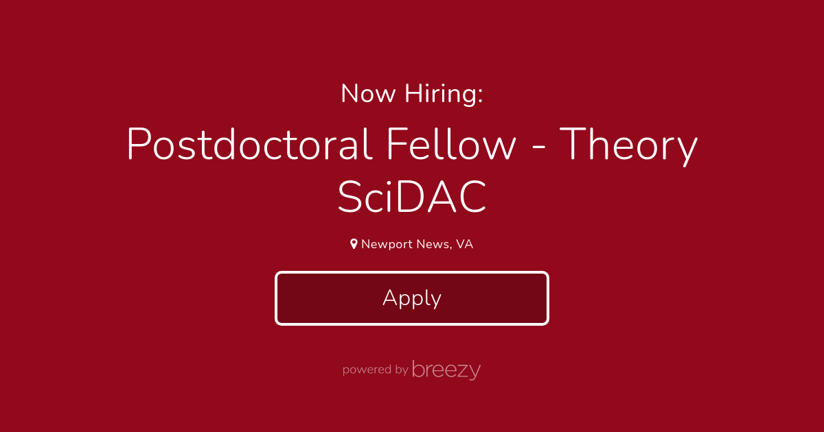 The Jefferson Lab Theory Center is seeking to fill a Postdoctoral Fellow position to start as soon as possible. The successful candidate will join the major nuclear physics SciDAC-5 project on “Femtoscale Imaging of Nuclei using Exascale Platforms”. We are particularly interested in candidates who have strong interest and background in QCD factorization to observables sensitive to single and multiple dimensional hadron structures (encoded in both TMDs and GPDs), and their extraction from data using QCD global analyses and Bayesian inference. This position is normally for two years, but outstanding performance may allow an extension to a third year. More about JLab and its Theory Center can be found at https://www.jlab.org/theory.